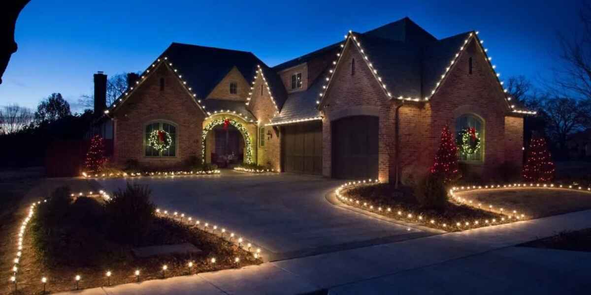 Classic elegance with warm white lights outlining your home's architecture and wrapped trees.